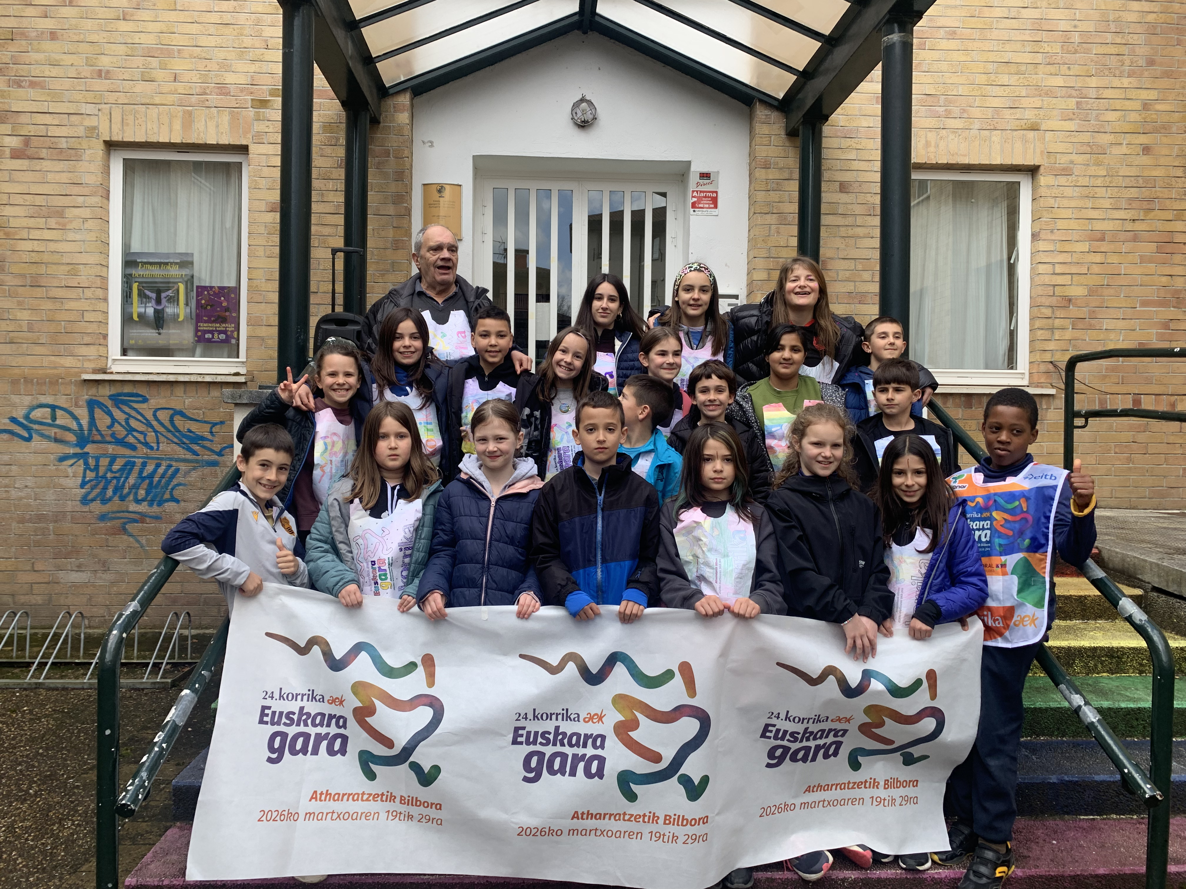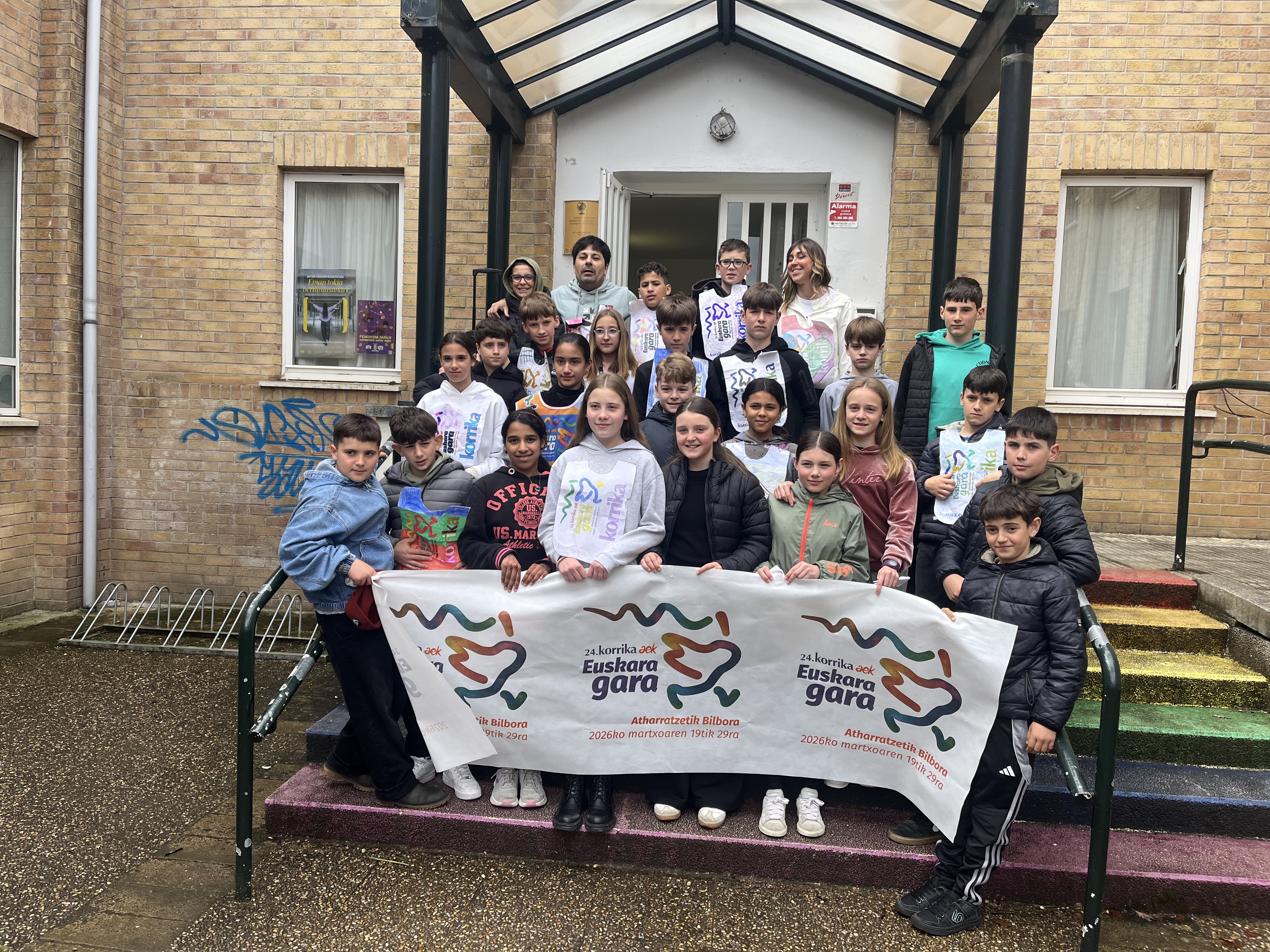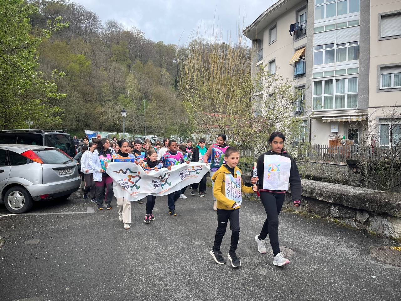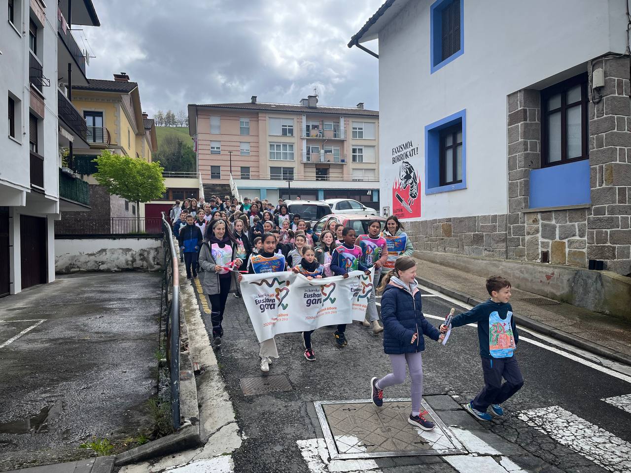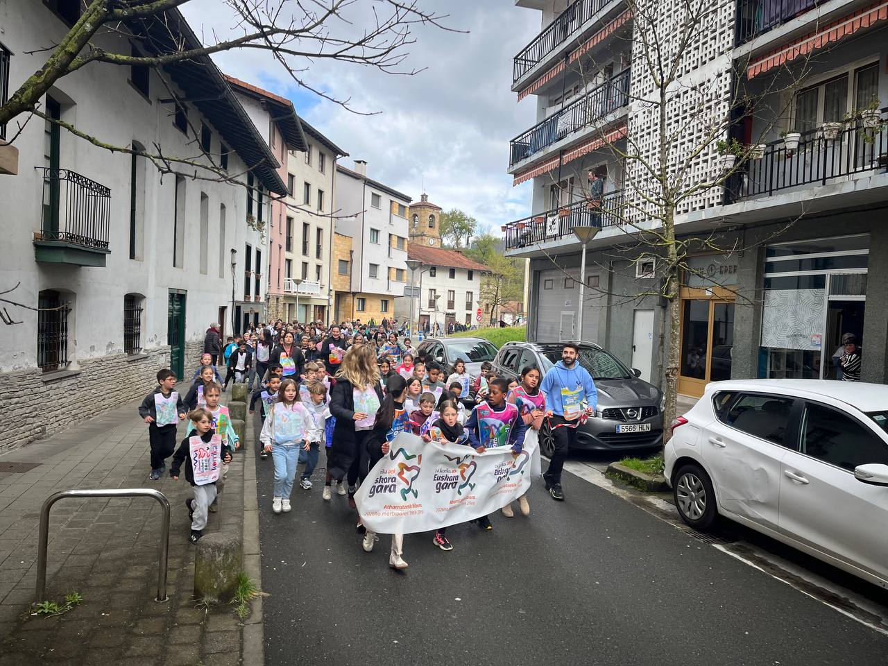 “Euskara gara” lelopean 11:30ean abiatu gara eskolatik eta aurtengoan ere lekukoa eskuz esku pasatu dugu adin guztietako ikasleen artean. Ibilbidearen amaieran, denok eskola atarian elkartu eta lekukoak zekarren mezua irakurri dugu. Aurtengoan, mezua Yolismar eta Nekanek ondu dute; AEK-k eta UEMA Udalerri Euskaldunen Mankomunitateak lankidetzan antolatutako Ongi etorri euskarara ikastaroko protagonistek, alegia.