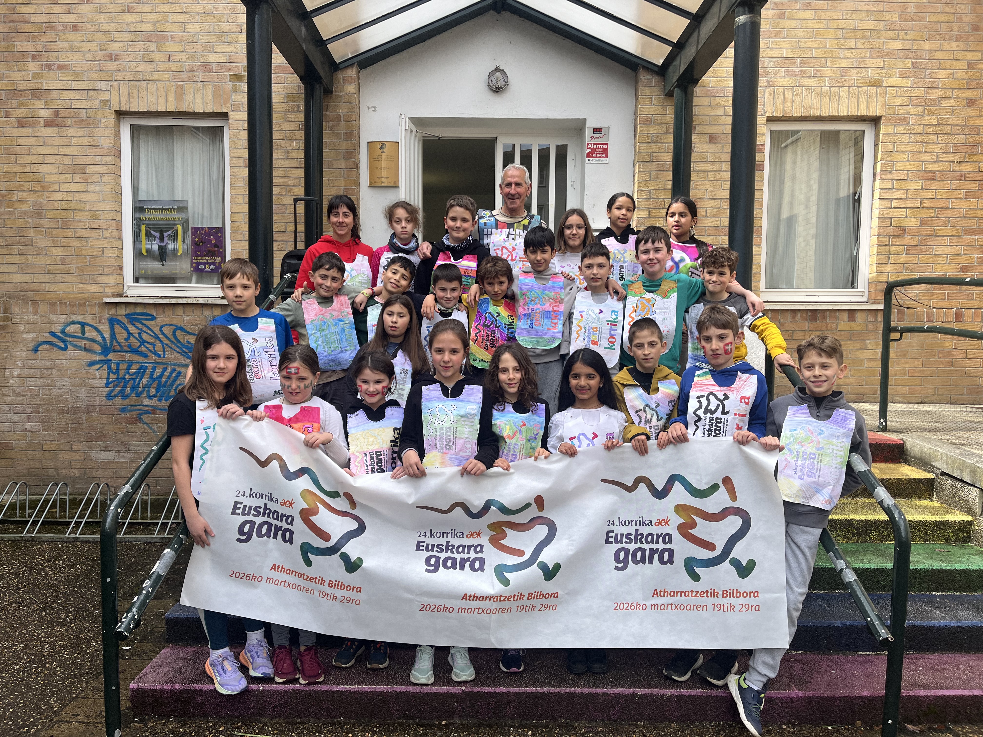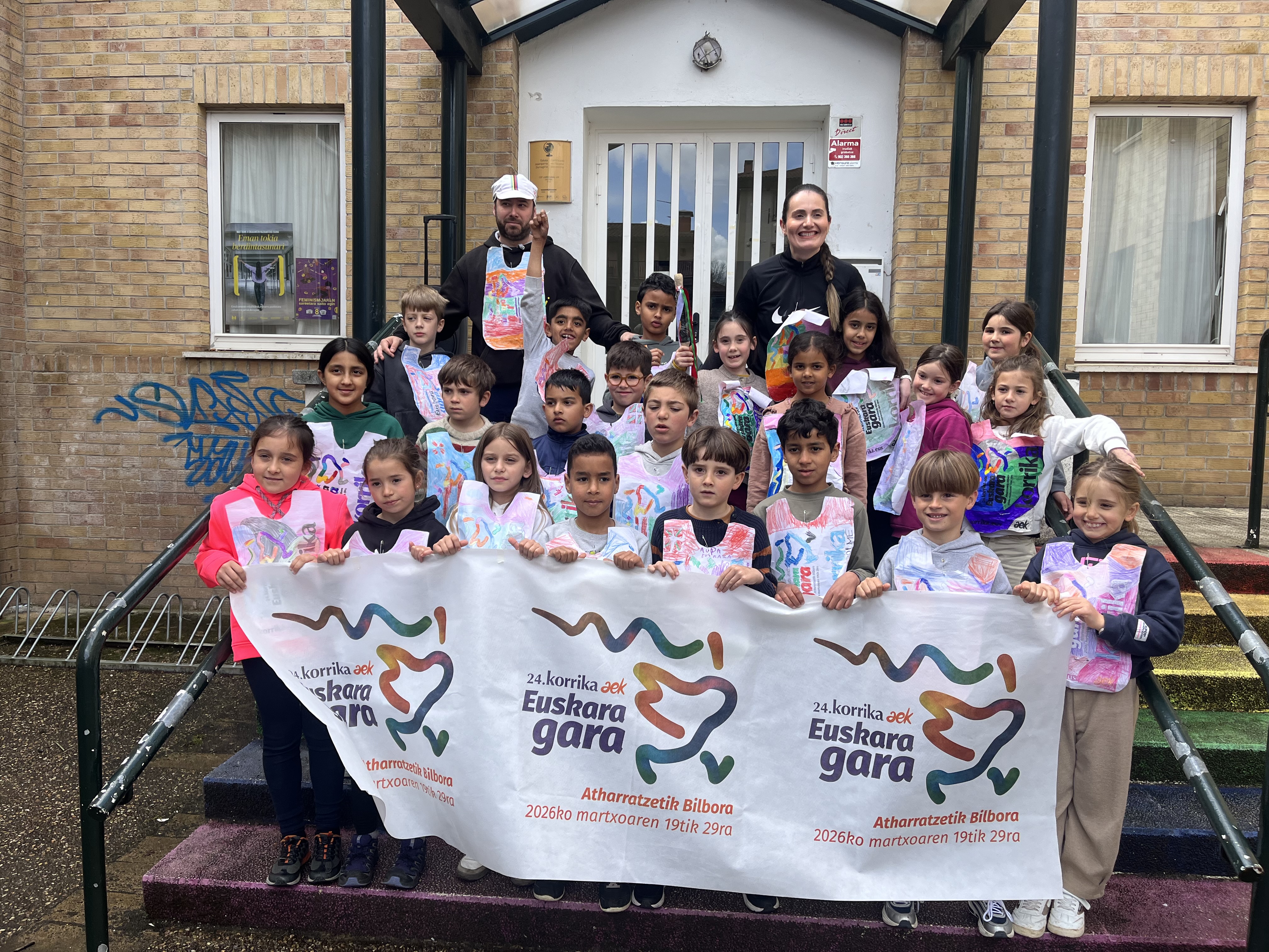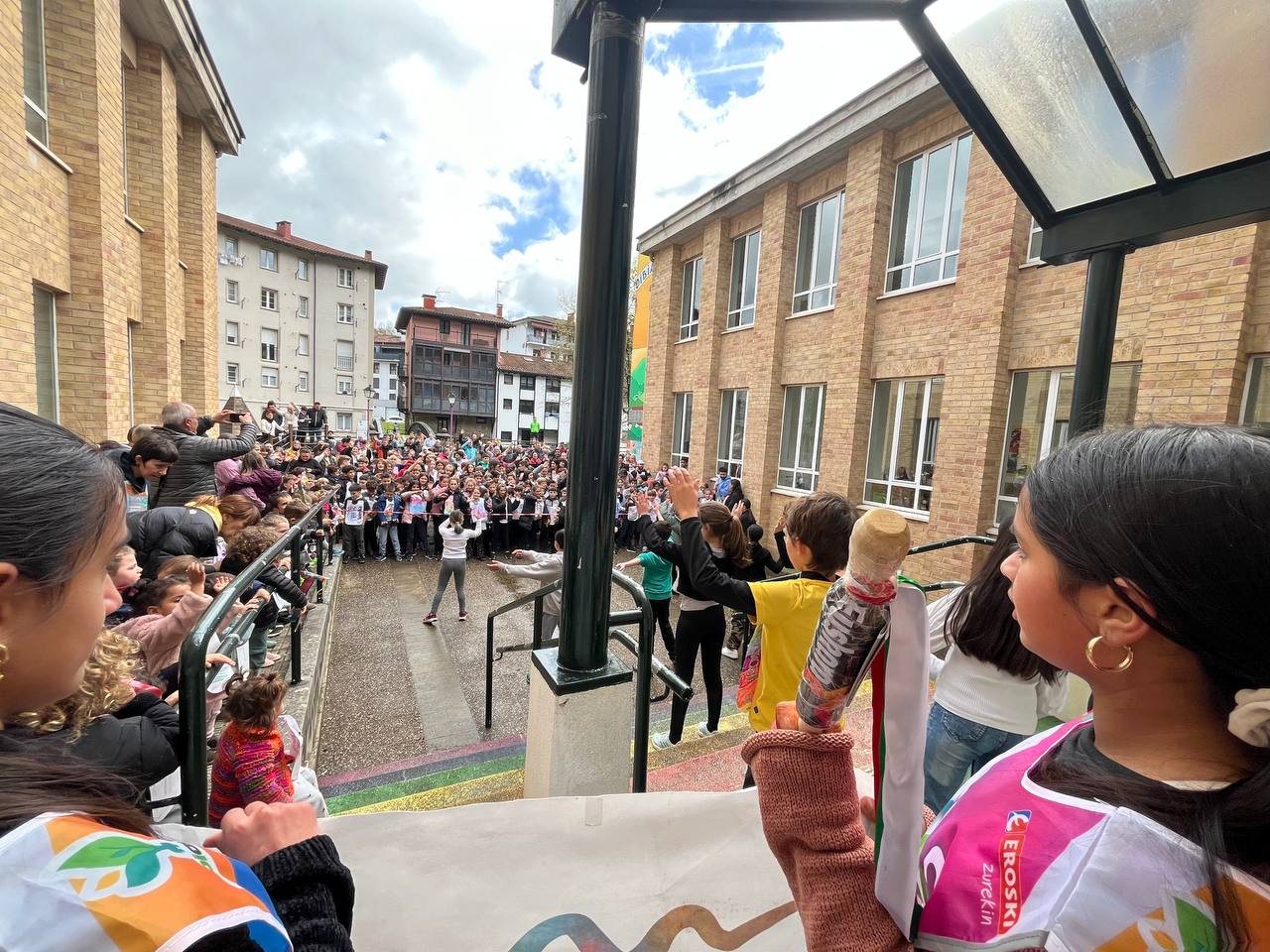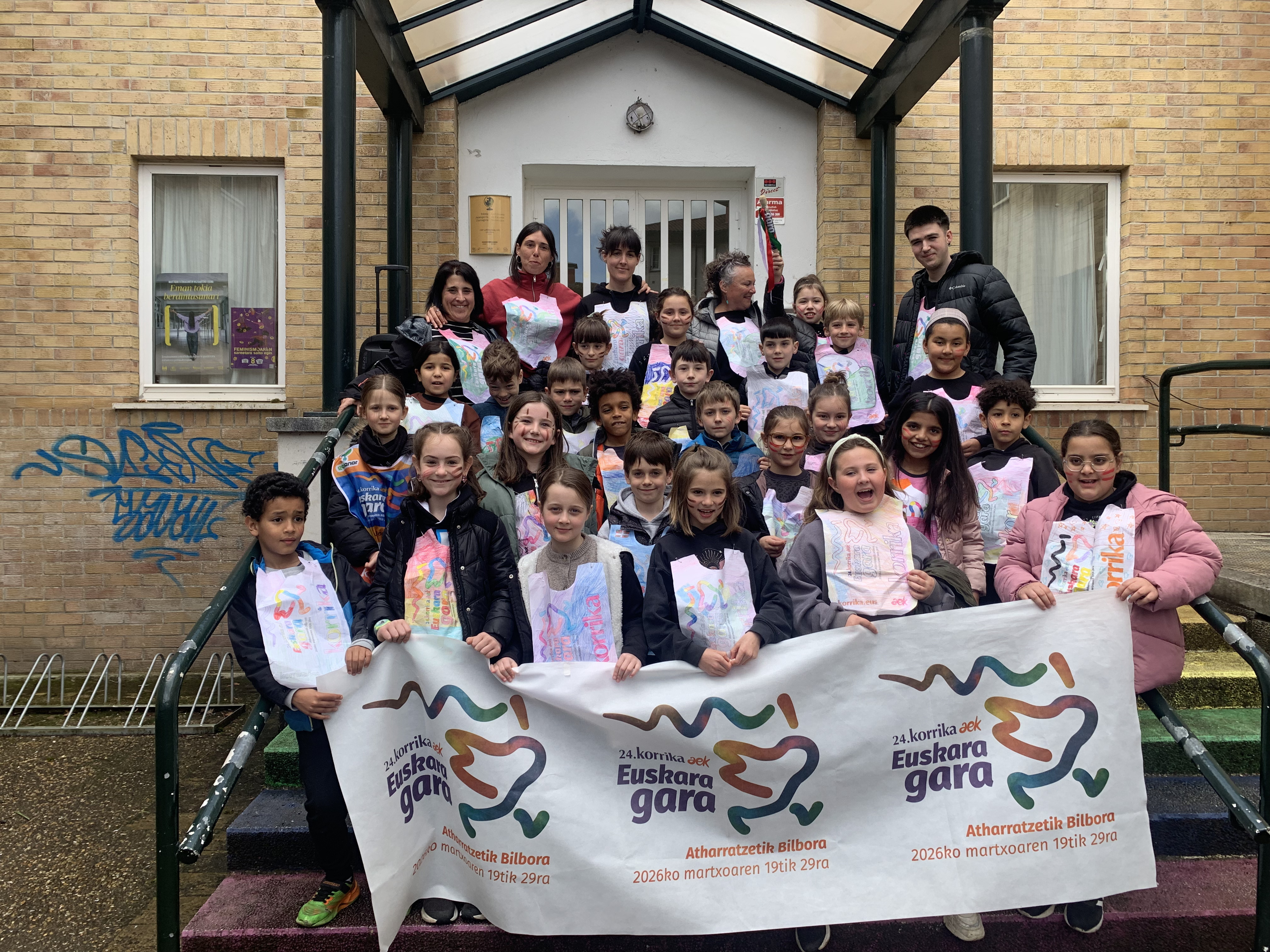 “Euskara gara” lelopean 11:30ean abiatu gara eskolatik eta aurtengoan ere lekukoa eskuz esku pasatu dugu adin guztietako ikasleen artean. Ibilbidearen amaieran, denok eskola atarian elkartu eta lekukoak zekarren mezua irakurri dugu. Aurtengoan, mezua Yolismar eta Nekanek ondu dute; AEK-k eta UEMA Udalerri Euskaldunen Mankomunitateak lankidetzan antolatutako Ongi etorri euskarara ikastaroko protagonistek, alegia.