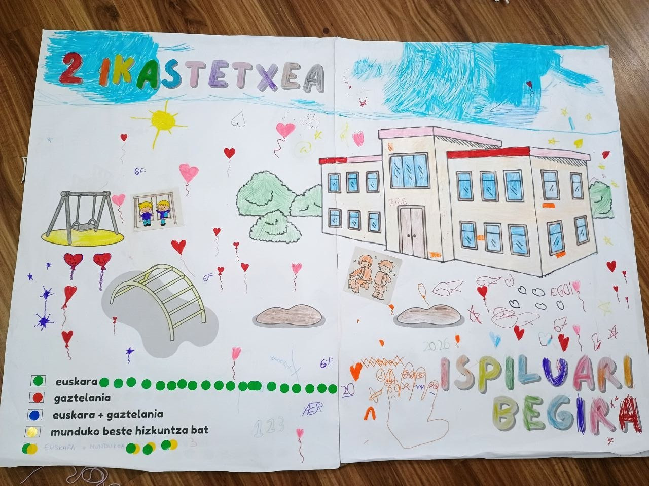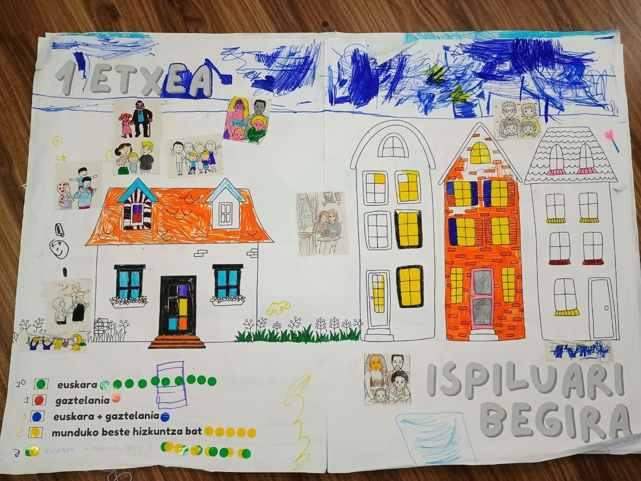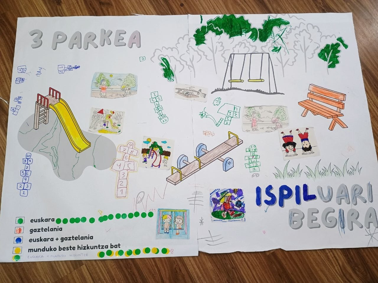 Ikasleek muralak margotu zituzten, eta etxean, eskolan eta parkean ZEIN HIZKUNTZATAN  hitz egiten duten adierazi zuten, koloretako gomets bidez.