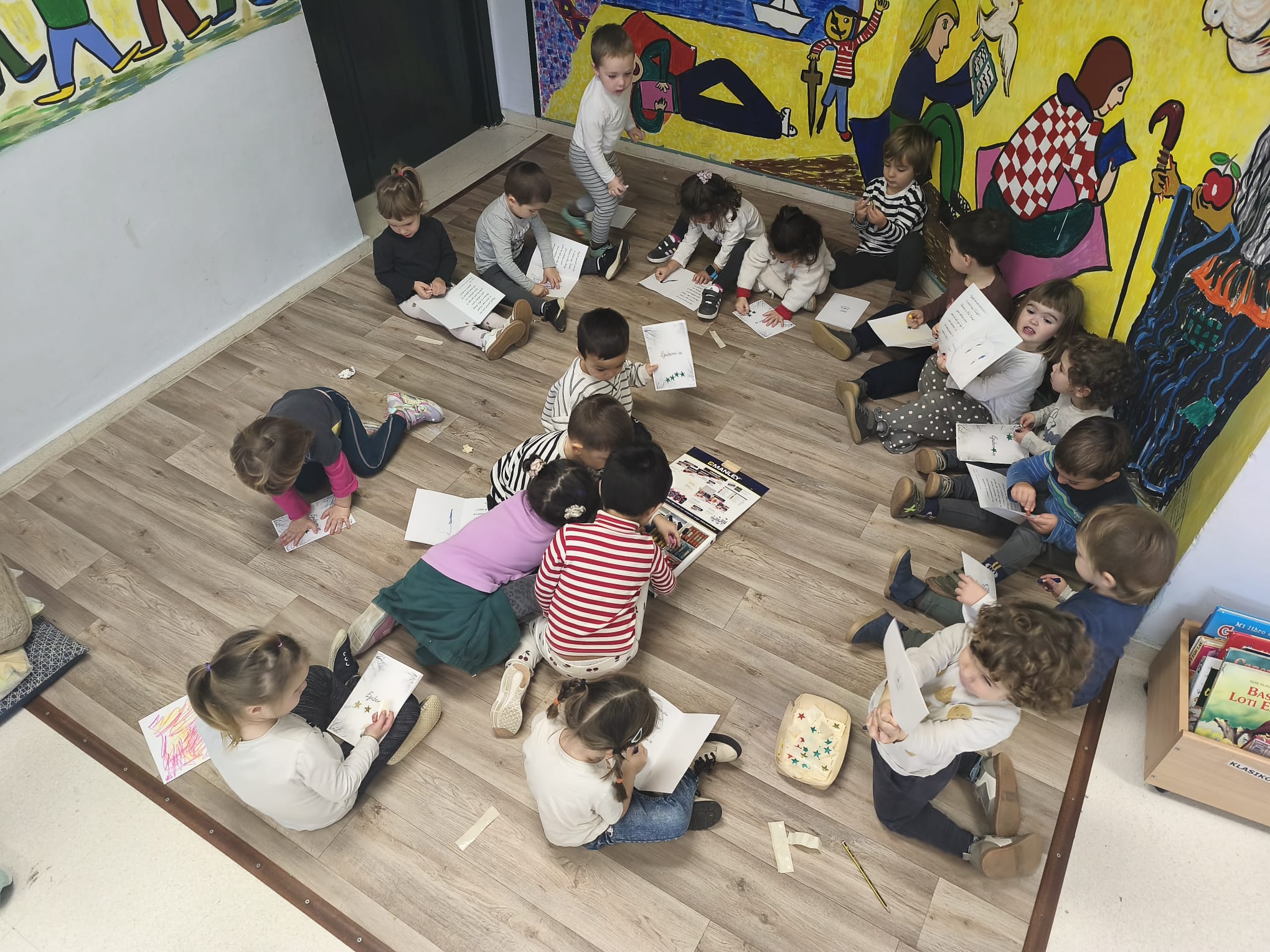 Oporrak badatoz eta astea girotzen joateko ekintza ezberdinak egin ditugu, Eguberritako postala apaindu dugu, jolasean ibili gara, Olentzero eta Mari Domingiren ipuina entzun dugu eta amaitzeko, Gabon kanta batzuk abestu eta kalejira batekin bukatu dugu.